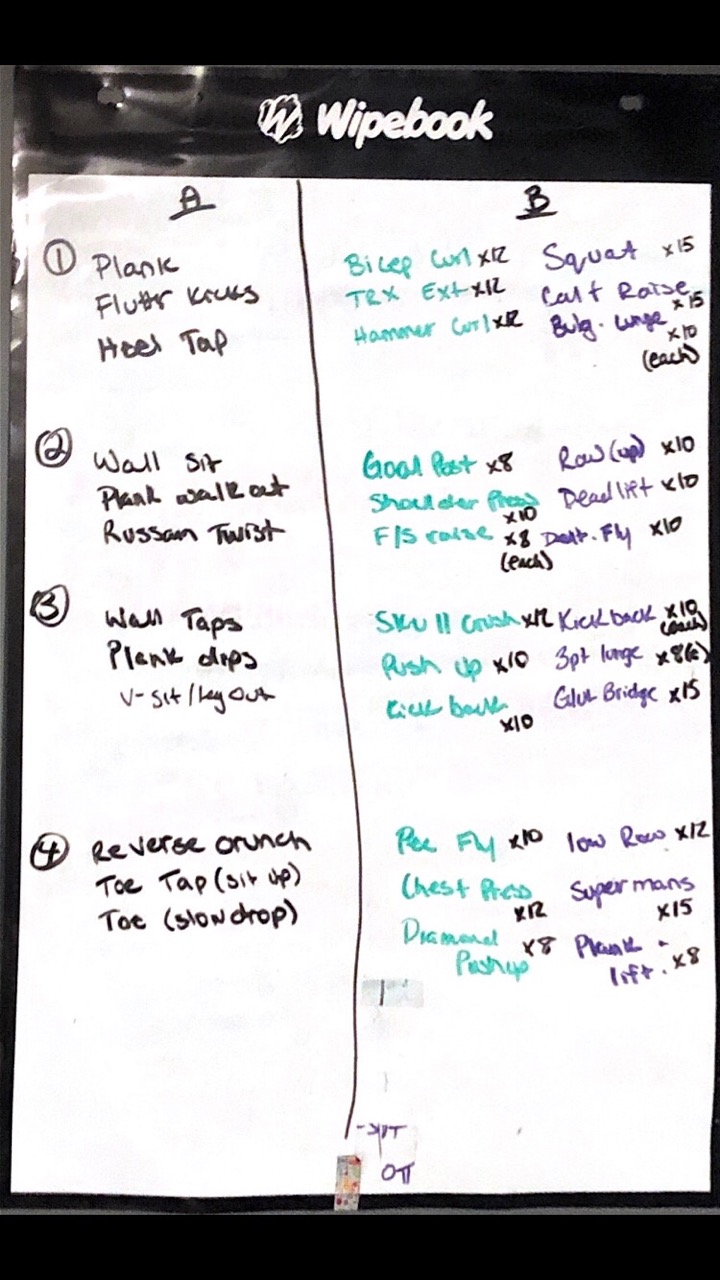 As Partner B completes bicep curl, Partner A is holding a plank. Partner B moves on to do Tricep Extension on the TRX, Partner A does flutter kicks until Partner B is finished their reps. Partner B moves on to hammer curl, and Partner A will do heel taps until Partner B finishes hammer curl. As Partner B moves on to squats, Partner A goes back to holding a plank. They switch like this until Round 1 is complete for Partner B, then they will switch so that A will be doing the full body and B will be working abs.