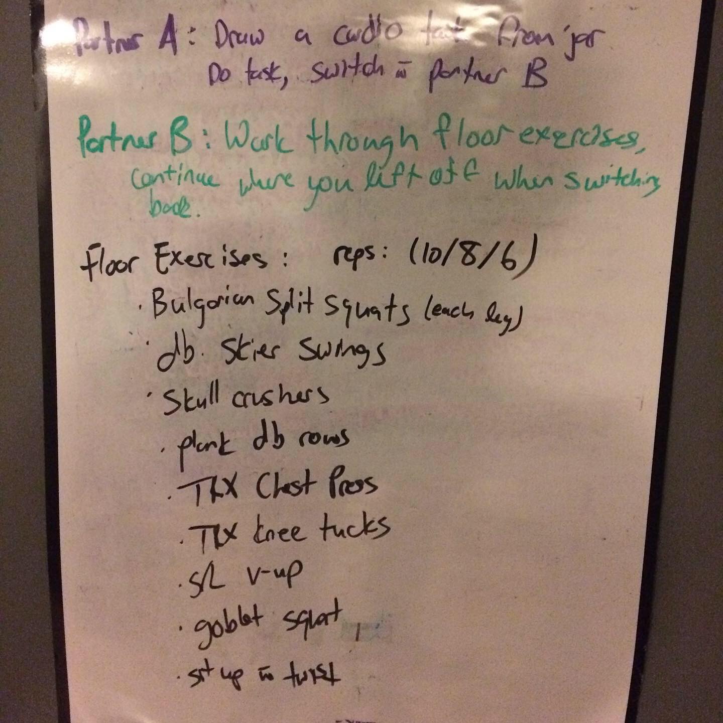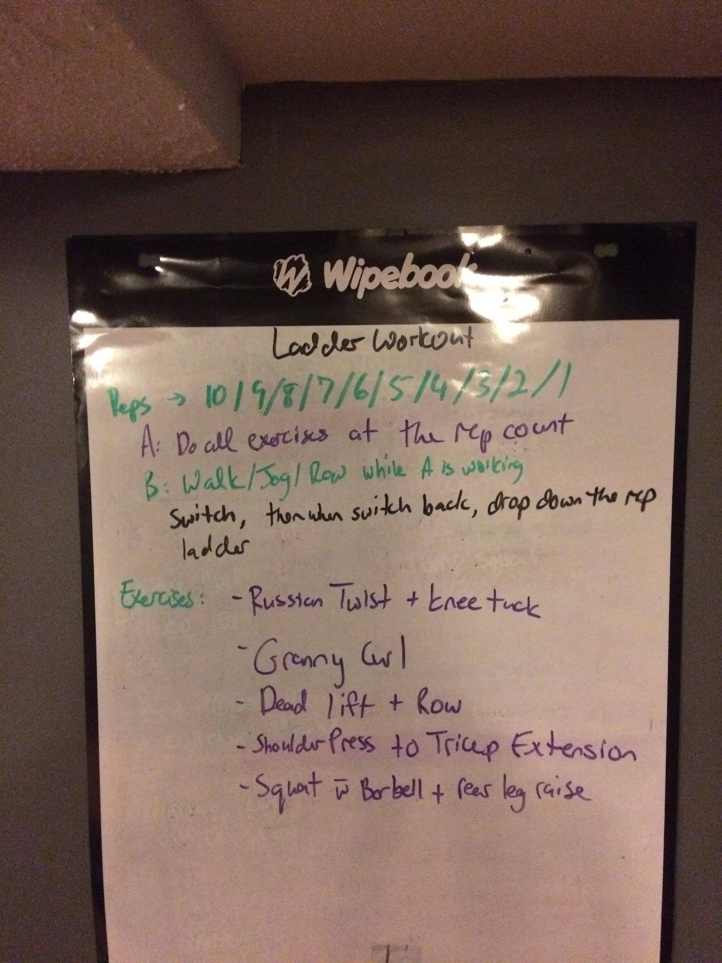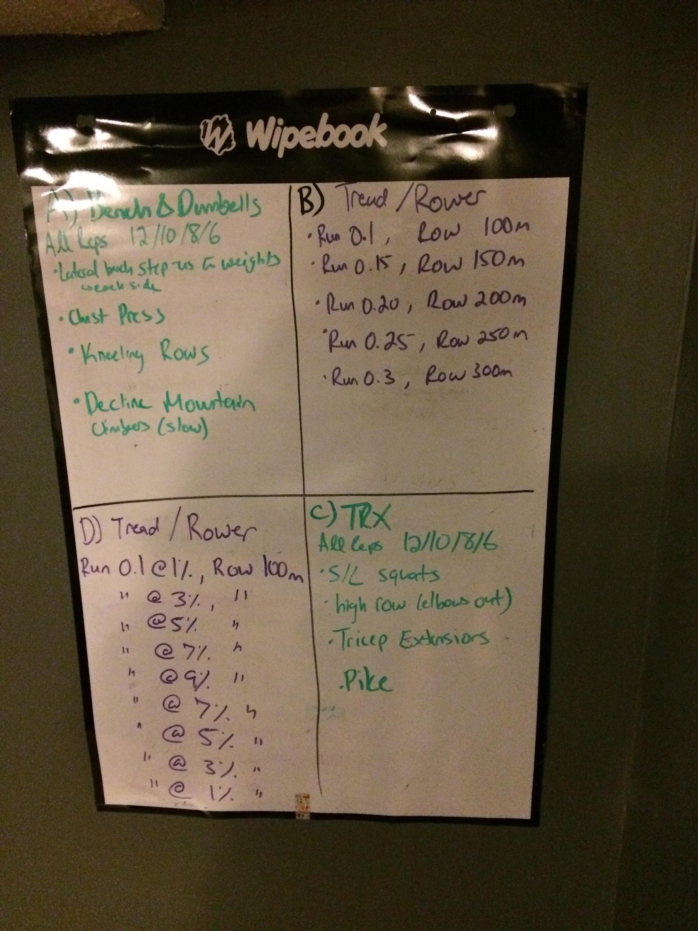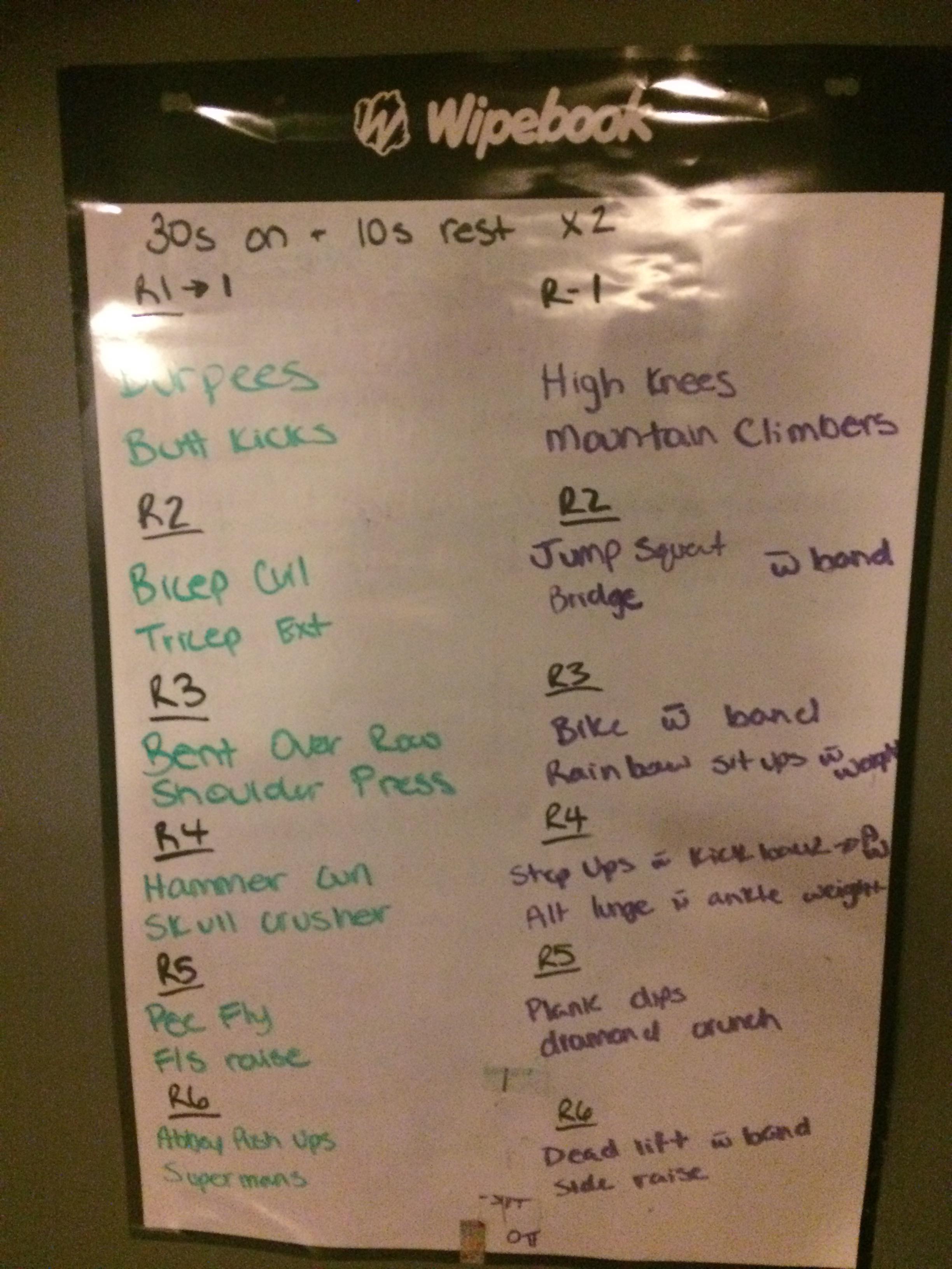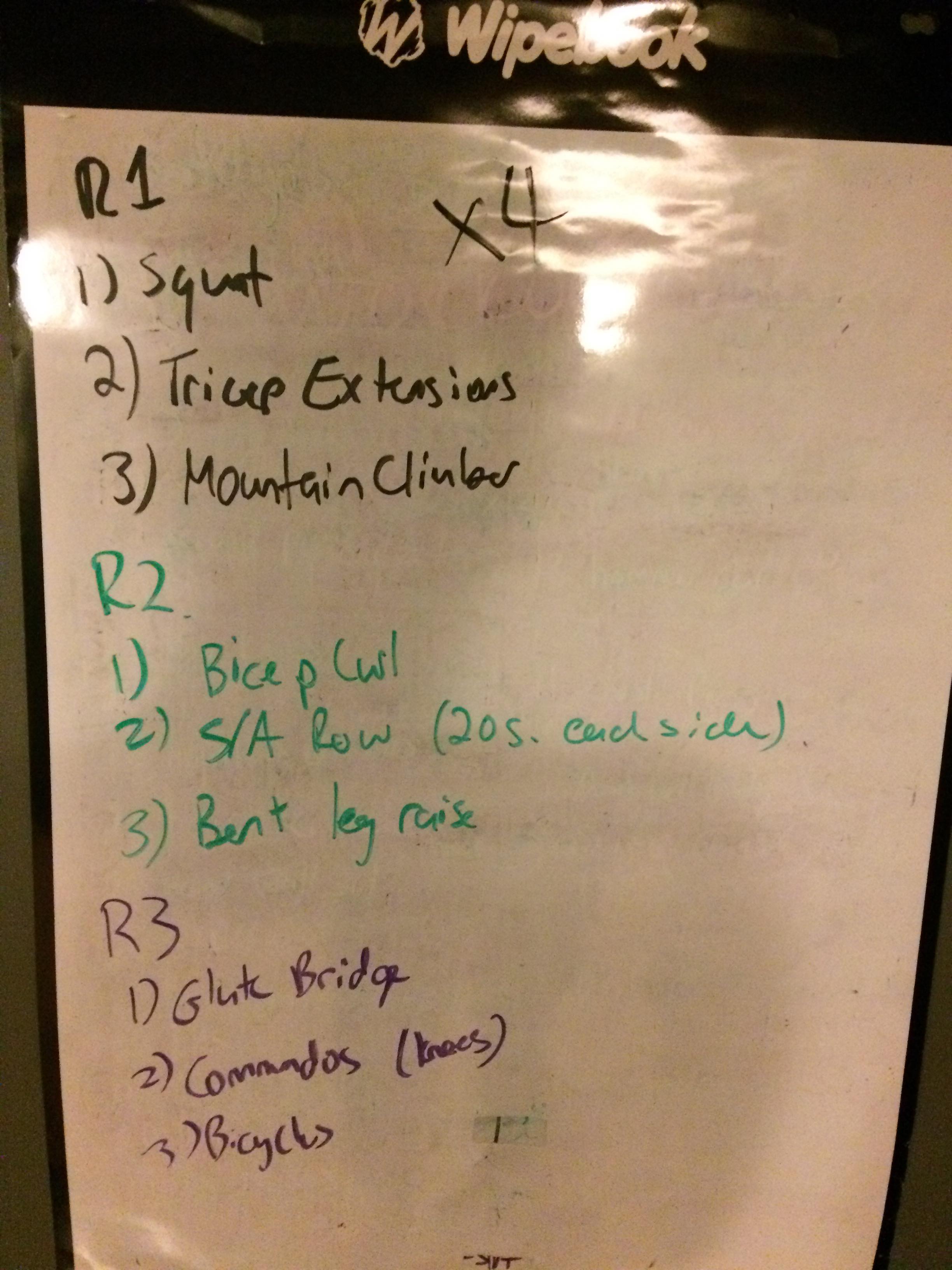 The white board picture shows the general idea for each station, including where they were located, but the stations also had instructions of the exercises to be done there and the transition movements you had to do to go to the next one. After one lap through, we recorded our times, and then did a second lap to beat those times. Both Ray and I managed to keep the laps around or under 15 minutes, making this a nice 30 minute full body workout.