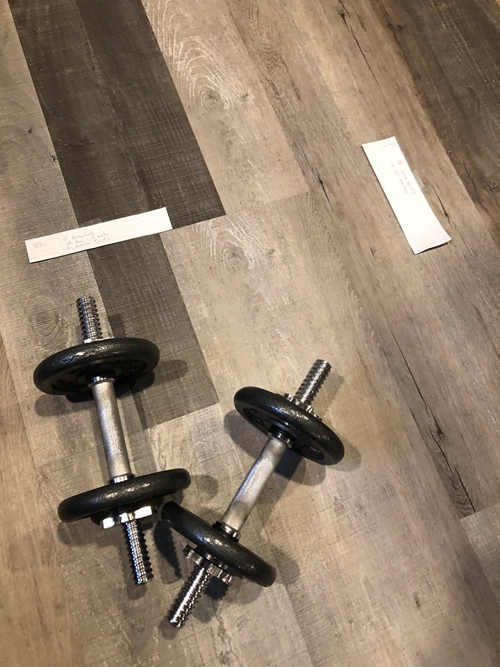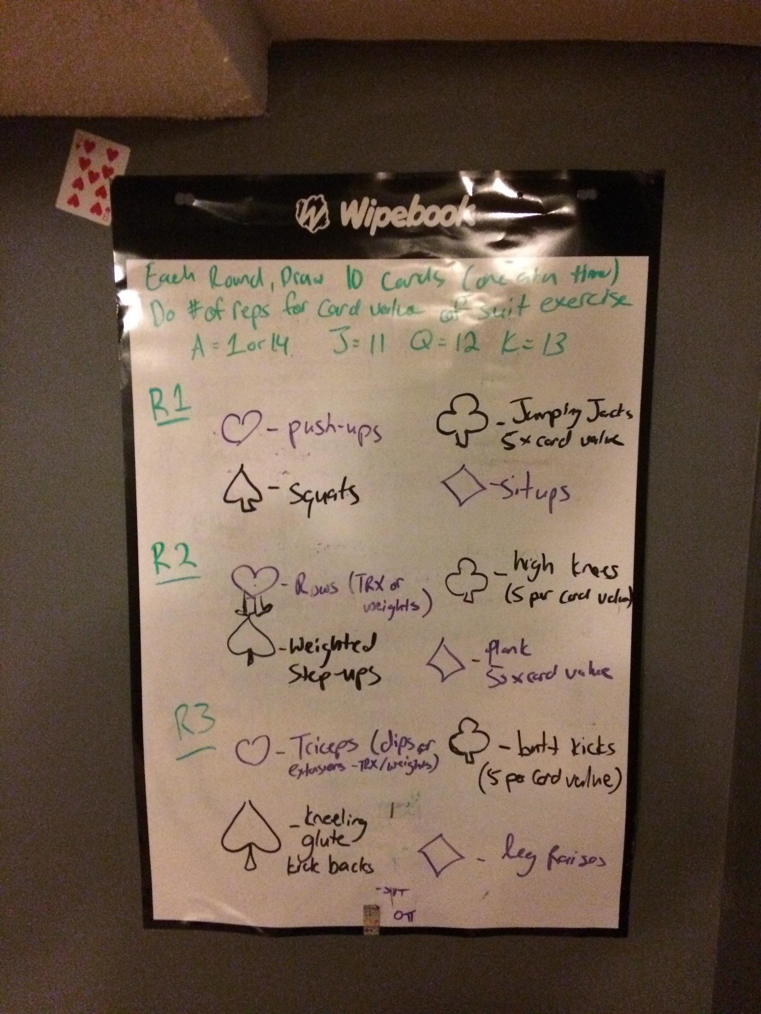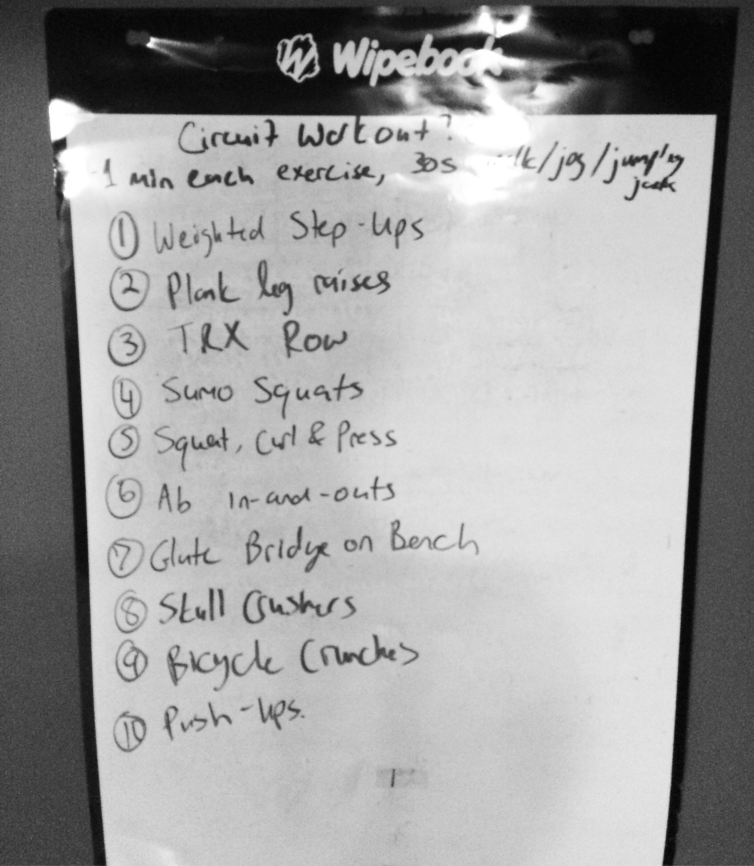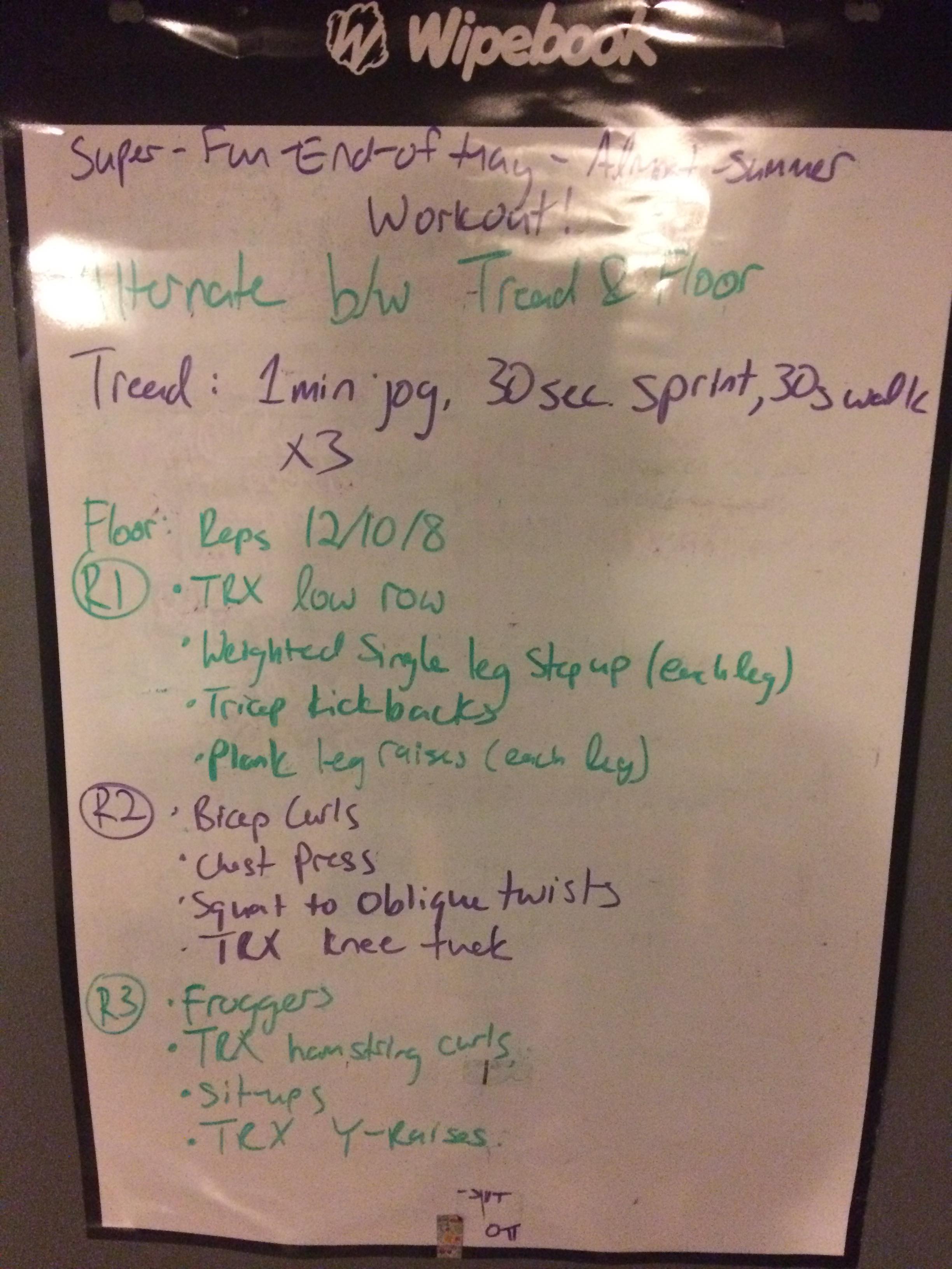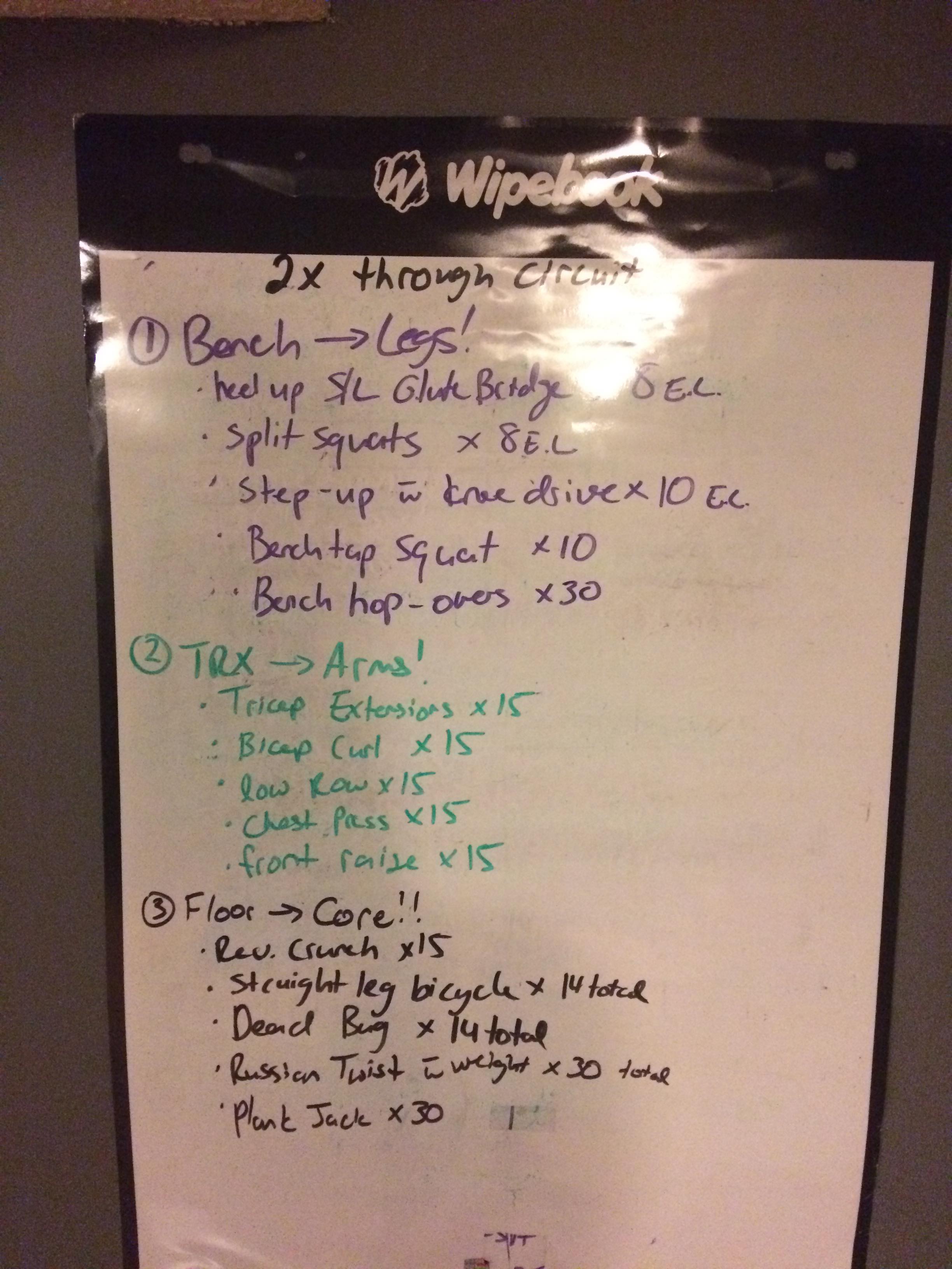 The white board picture shows the general idea for each station, including where they were located, but the stations also had instructions of the exercises to be done there and the transition movements you had to do to go to the next one. After one lap through, we recorded our times, and then did a second lap to beat those times. Both Ray and I managed to keep the laps around or under 15 minutes, making this a nice 30 minute full body workout.