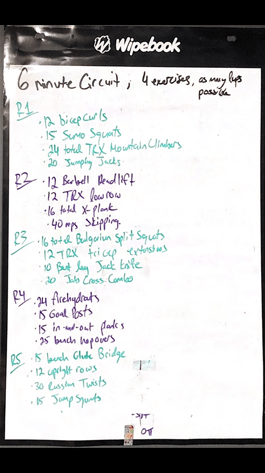 Setup: 6 minutes per circuit, as many laps of the 4 exercises as possible. 1 minute break before moving on to the next round.