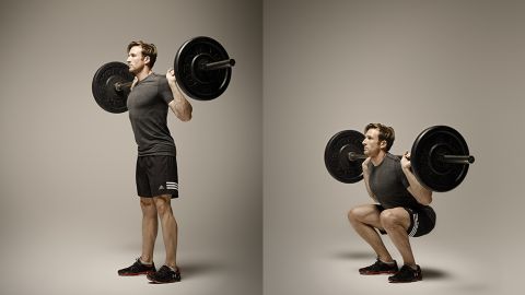 Back Squats: Keep your legs shoulder width apart and rest the barbell on your shoulders behind you. With the weight supported drop into a squat, then push back up to standing.