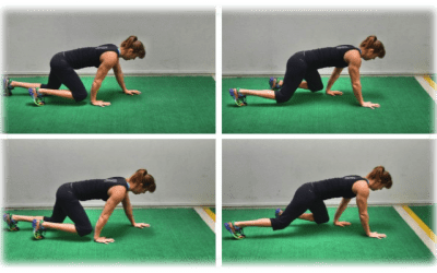 Bear Crawl: Start on all fours, flex and tuck your toes so they are griping the ground. Shift back onto your toes to lift your knees off the ground by about 1-2 inches. From this position move forward by extending your right arm and left foot, then altenrately, your left arm and right foot. Try to keep your back level the entire time while crawling forward.