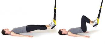 TRX Hamstring Curl: Sit facing the TRX system and place your feet into the stirrups heels first. Lay back flat against the floor with your legs extended (and heels in the stirrups). Raise your hips off of the floor, holding your weight in your heels and keeping your core tight. Curl your heels back towards your butt. When your knees are at 90 degrees, pike your hips up towards the ceiling. Lower your hips back down and extend your feet back out straight, into the start position.