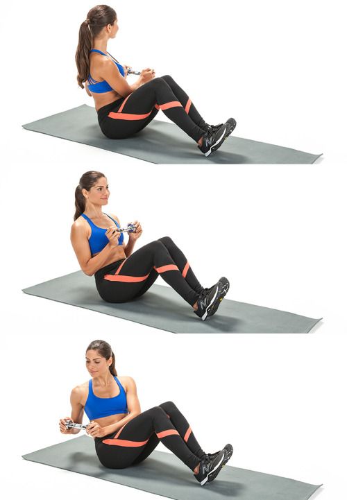 Russian Twists: Start seated with knees bent and feet flat on the floor, holding one dumbbell with both hands in front of chest. Keeping the spine long and the abdominals tight, lean back slightly and lift the feet a few inches off the floor (to modify, keep the feet on the floor). Slowly twist the torso to the left and bring the dumbbell beside the left hip. Return to centre. and then slowly twist to the right and bring the weight beside the right hip to complete one rotation.