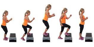 Step-Ups: Standing in front of a bench, step-up with your right foot, followed by your left foot. Come back down with right foot then left foot. To switch sides, simply step up (and back down) with your left foot first.
