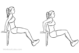 Tricep Dips: Position your hands shoulder-width apart on stair. Slide your butt off the stair with your legs extended out in front of you. Straighten your arms, keeping a little bend in your elbows. Slowly bend your elbows to lower your body toward the floor until your elbows are at about a 90-degree angle. Press down into the stair to straighten your elbows, returning to the starting position.