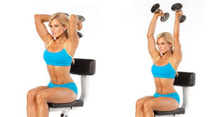 Shoulder Press to Tricep Extension: Start by holding the dumbbells at your shoulders and extend arms straight up (this is the shoulder press). When your arms are extended, bend your elbows to bring the weights behind you, then extend back upwards (this is the tricep extension). Bring the weights back down to your shoulder level starting position to complete one rep.