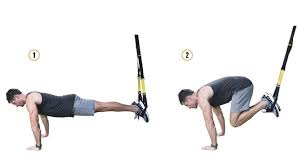 TRX Knee Tuck: To start, place your feet securely into the foot cradles positioned directly under the anchor point. Apply downward pressure with the tops of your feet by flexing your ankles, holding yourself in a high plank. Bend your knees to bring your feet towards your chest, then push back out to the starting position.